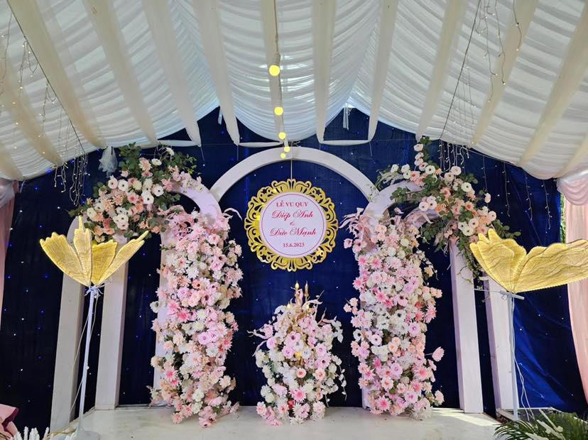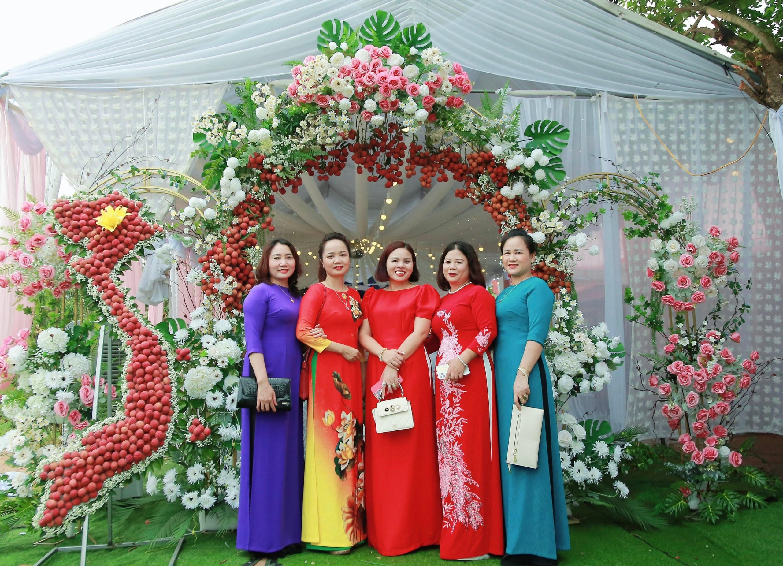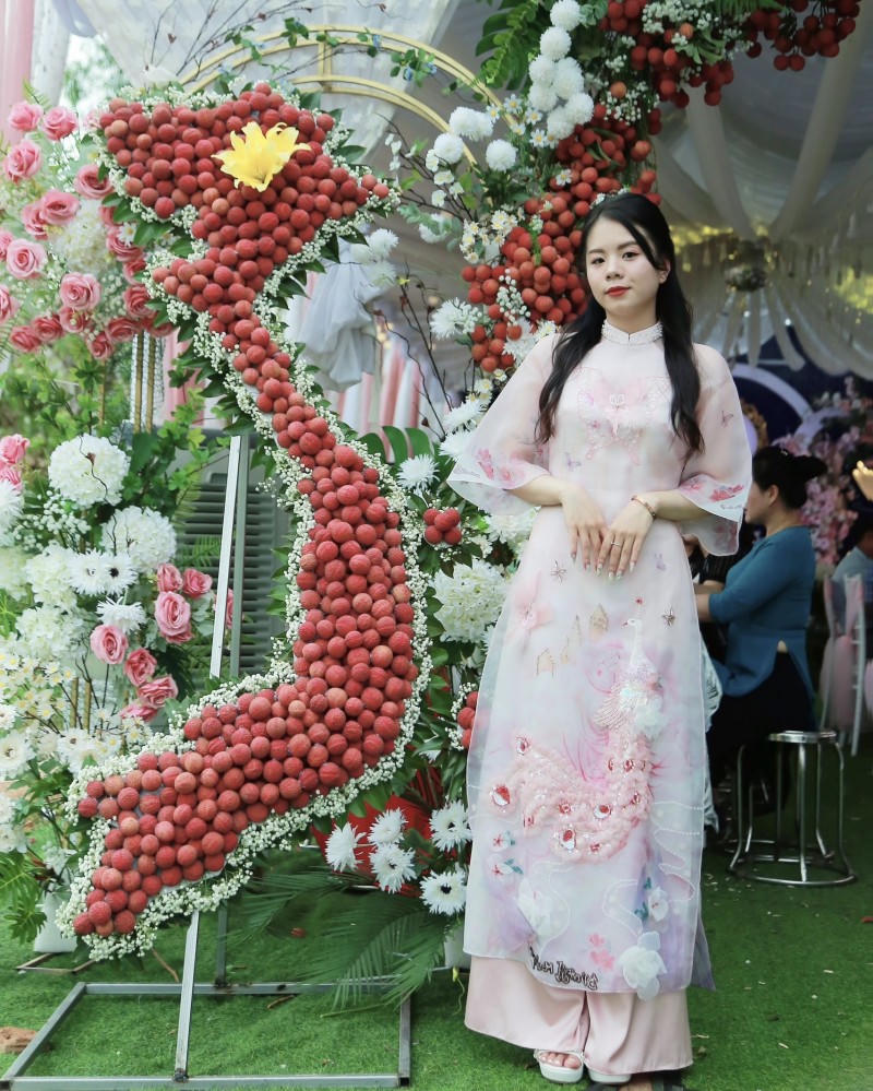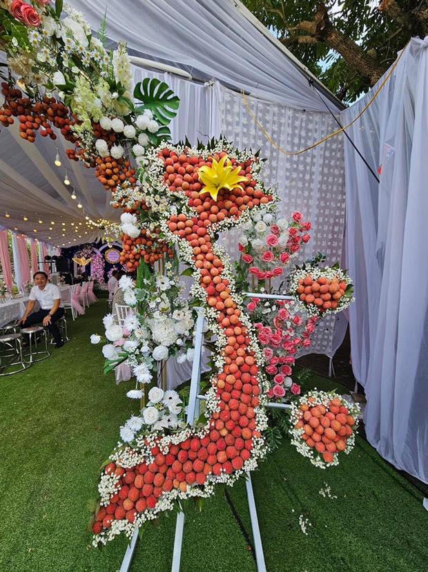 Cô dâu Diệp Anh cho biết, cô khá bất ngờ khi những hình ảnh tại đám cưới của mình được cộng đồng mạng quan tâm. Người đưa ra ý tưởng làm cổng rạp cưới trang trí bằng vải thiều tươi chính là mẹ của cô.