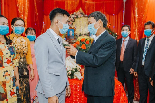 Trước khi đám cưới diễn ra, gia đình chú rể gọi điện cho từng người thân, dặn dò phải mang khẩu trang. Tại hôn lễ, khách mời được đo thân nhiệt cẩn thận.