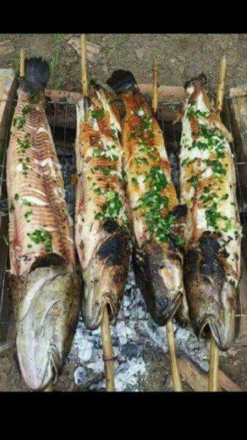 Sau đó, rửa sạch cá, xiên một cành tre tươi (để tre không bị cháy trong quá trình nướng) dọc theo thân cá rồi cắm ngược đầu cá xuống đất. Rơm được chất đống phủ lên mình cá, nhiều nhất là phần đầu cá, vì đây là phần rất khó chín. Nếu thiếu lửa thì cá sẽ bị sống, nếu dư lửa cá sẽ khô, mất nước, ăn không ngon.