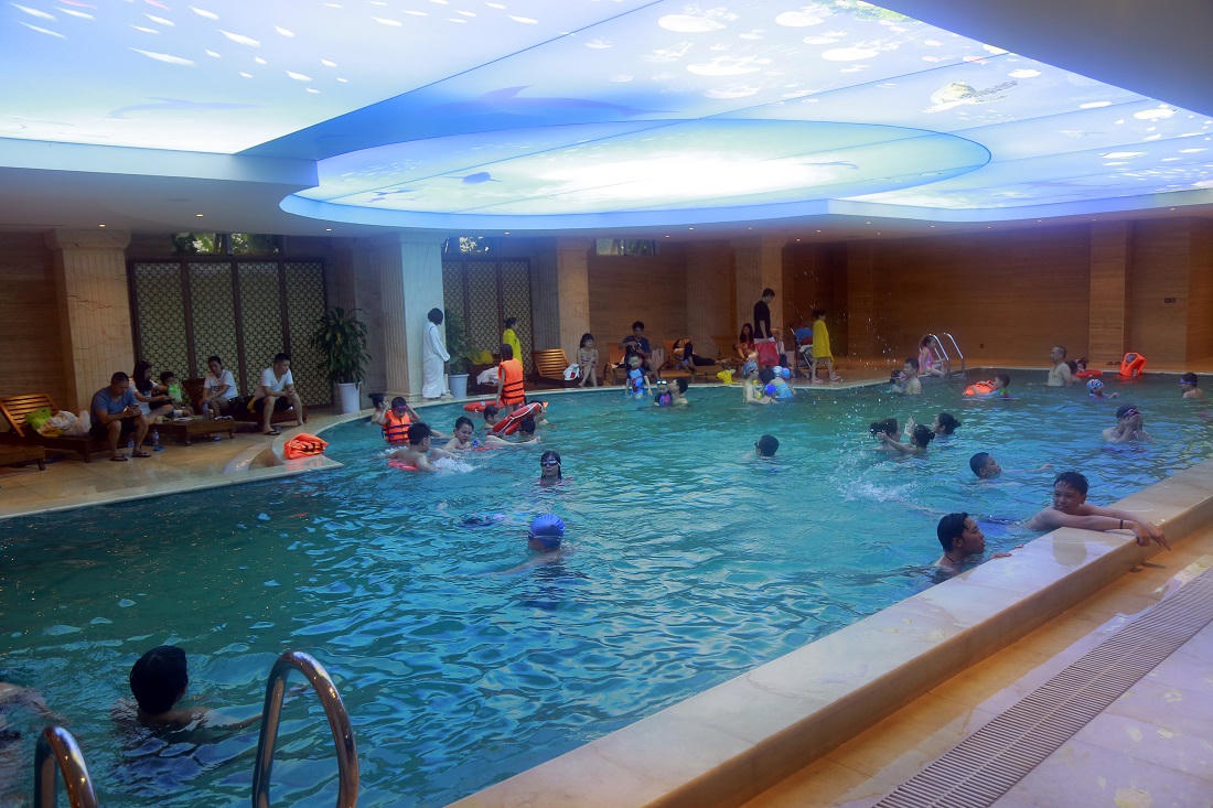 Du khách cũng có thể thoải mái ngâm mình trong làn nước mát tại bể bơi bốn mùa nằm ngay cạnh khu Spa. Hình ảnh đại dương sống động được trang trí trên trần thủy tinh sẽ khiến các thành viên nhỏ nhất như lạc trong thế giới thủy cung đầy màu sắc.