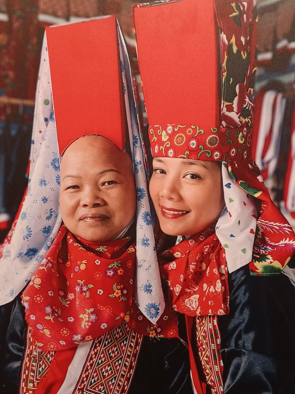 Bông Mai chụp với đồng bào Dao (thanh phán) ở Hoành Mô, Bình Liêu, Quảng Ninh. (Ảnh từ triển lãm) |