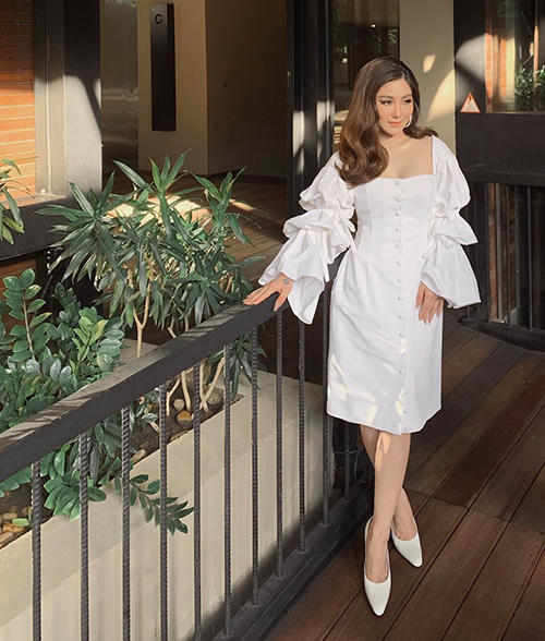Ca sĩ Thủy Tiên diện đầm công chúa dự sự kiện. "Tại em hơi ngọt nên cứ sợ anh bị sâu răng", bà xã Công Vinh hài hước viết.