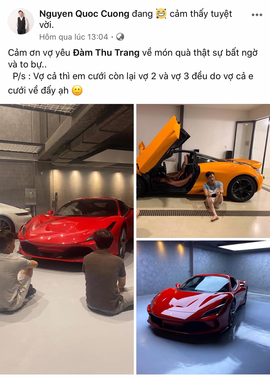 Không giấu nổi hạnh phúc, Quốc Cường đã chia sẻ trên trang cá nhân khi nhận được món quà khủng của bà xã: “Cảm ơn vợ yêu Đàm Thu Trang về món quà thật sự bất ngờ và to bự… Vợ cả thì em cưới còn lại vợ 2 và vợ 3 đều do vợ cả em cưới về đấy ạ”.
