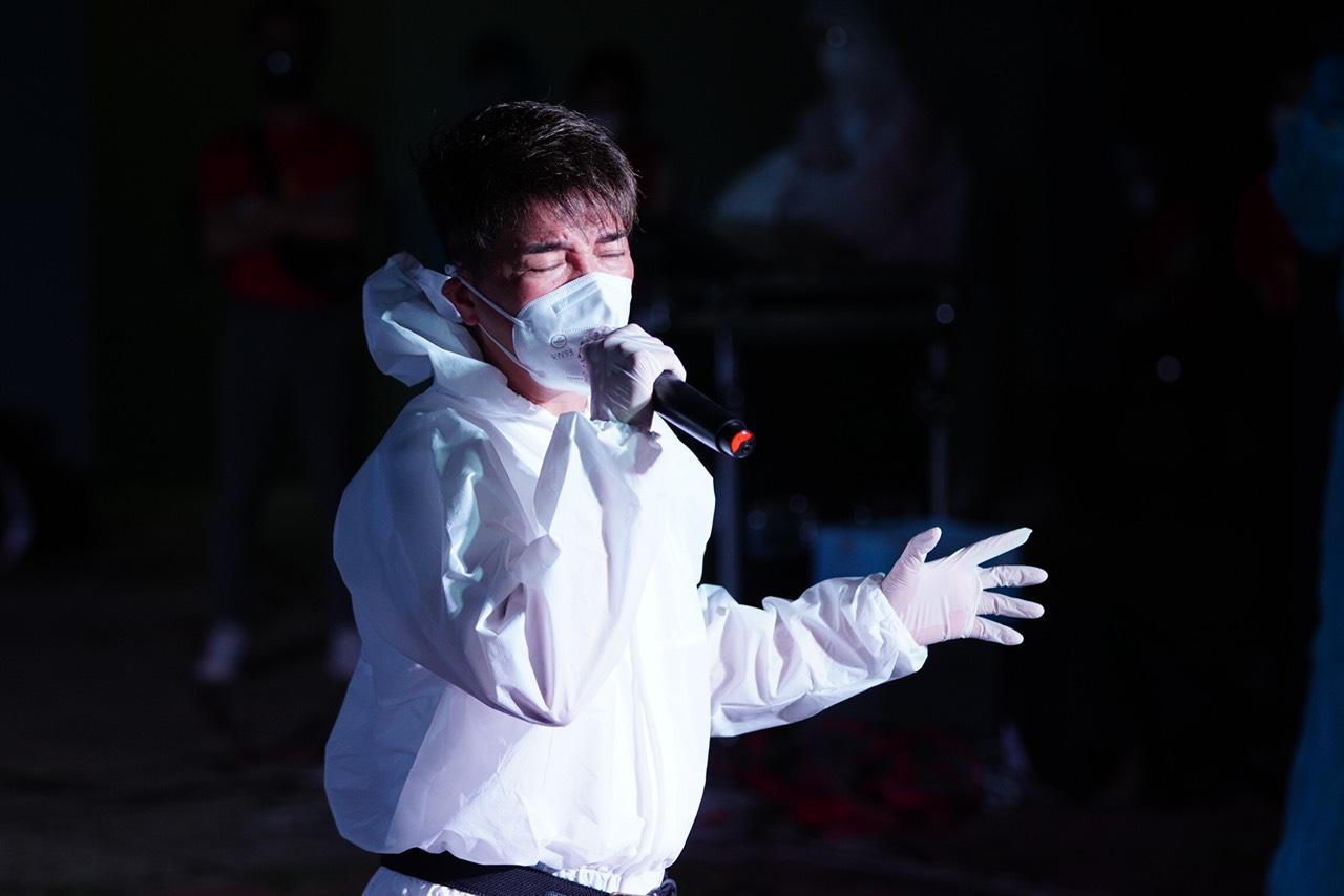 Nam ca sĩ diện đồ bảo hộ, xúc động chia sẻ cùng các y, bác sĩ. |