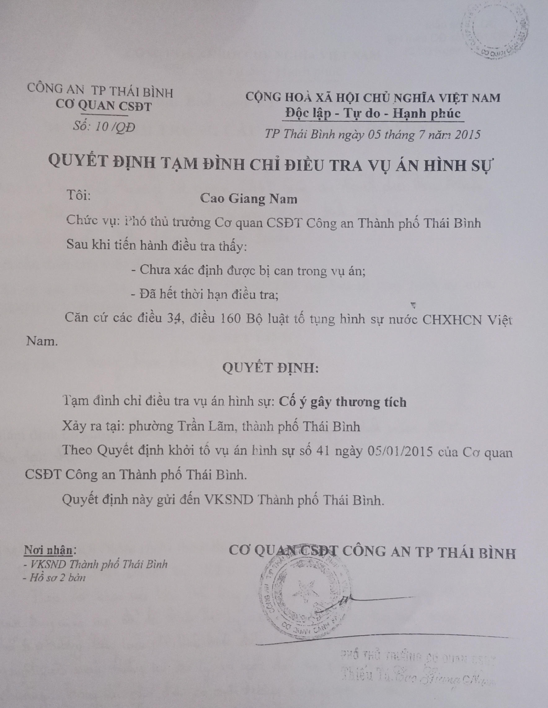 Bất ngờ hơn nữa, 6 tháng sau đó, đến ngày 5/7/2015, Cơ quan CSĐT Công an TP Thái Bình lại ra Quyết định số 10 tạm đình chỉ điều tra vụ án hình sự nói trên. Văn bản do Thiếu tá Cao Giang Nam, Phó thủ trưởng Cơ quan CSĐT ký. Lý do của quyết định này là: Chưa xác định được bị can trong vụ án và đã hết thời hạn điều tra.