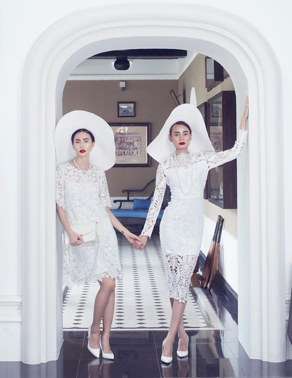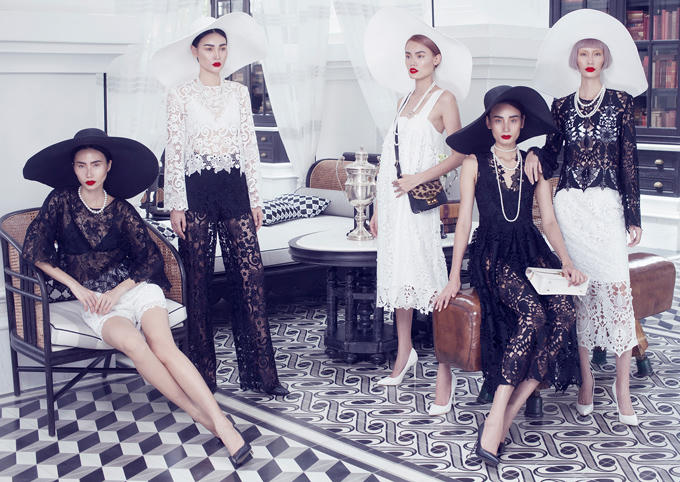 Giữa không gian đậm chất cổ điển, dàn chân dài gồm Thanh Thủy, Thùy Trang, Lê Thanh Thảo, Lê Thúy và Hằng Nguyễn (từ trái qua) mang đến hình ảnh quý cô thanh lịch trong những thiết kế mở màn cho "Life in Color".