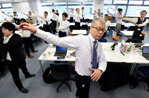 Đúng 1h chiều, nhóm nhân viên IT thuộc Công ty Adoc International ở Tokyo (Nhật Bản) đứng dậy, rời khỏi bàn làm việc để thực hiện những động tác co giãn, vặn mình theo tiếng radio đang phát: "Một, hai, ba". Cùng lúc, tại Công ty Fujikura, những người đàn ông vận sơmi, quần tây lủng lẳng trên những thanh xà đủ màu sắc. Tất cả họ đều đang tham gia tập thể dục giữa giờ, một chính sách được hàng loạt doanh nghiệp Nhật Bản đẩy mạnh gần đây.