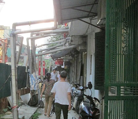 Chị Huyền, người dân khu tập thể này cho biết, nhiều ống dẫn nước thải đã quá cũ bị nứt vỡ, gây rò rỉ rớt xuống người đi đường, nhiều khi người dân phải đội nón, che ô dù, hay chụp túi nilon lên đầu để đi qua hệ thống ống dẫn thải này.