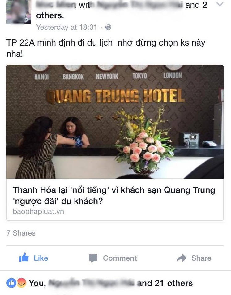 Không dừng lại ở đó, chỉ vài giờ sau khi bài viết được đăng tải, đã có hàng nghìn lượt chia sẻ, kêu gọi cảnh giác và đồng loạt tẩy chay khách sạn Quang Trung (Hải Tiến). Phần lớn ý kiến cho rằng, việc “ép” khách phải ăn tại nhà hàng của khách sạn đã là vô lý, không chấp nhận được chứ đừng nói thực tế, đoàn đó có ăn ủng hộ 1 bữa theo thỏa thuận nhưng vì chất lượng đồ ăn quá kém nên họ mới buộc phải ra ngoài ăn.