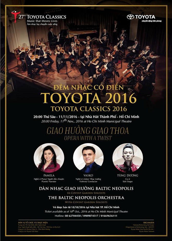 (PLO) -Đêm nhạc Cổ điển Toyota 2016 -Toyota Classics 2016 với chủ đề “Giao hưởng giao thoa” diễn ra một đêm duy nhất vào lúc 20h00 ngày 11/ 11/ 2016 tại Nhà Hát TP HCM. Đêm nhạc Cổ điển Toyota 2016 có sự tham gia biểu diễn của Dàn nhạc giao hưởng Baltic Neopolis - một trong những dàn nhạc độc đáo bậc nhất của Ba Lan.