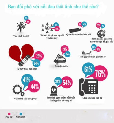 Nhiều nhất là tâm sự với bạn bè, 61% đàn ông và 76% phụ nữ chọn cách này. Tiếp đó là chọn cách gặm nhấm nỗi đau một mình hay làm việc để quên sầu. Nằm cuối danh sách là hành động trả thù.