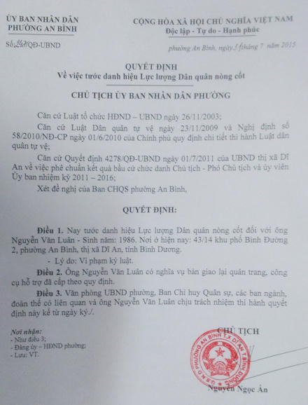 UBND phường An Bình (TX. Dĩ An, Bình Dương) vừa mới có quyết định tước danh hiệu dân quân với Nguyễn Văn Luân (SN 1986) về hành vi đánh người, đồng thời kỷ luật khiển trách ông Đoàn Thanh Phụng, chỉ huy ca trực vào ngày 19/7 (thử thách trong vòng 6 tháng) và ông Đinh Văn Khanh, trung đội phó về hành vi kiểm tra xe máy sai quy định.