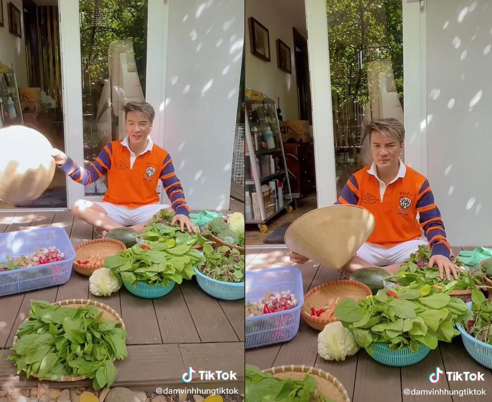 Đàm Vĩnh Hưng hóa thành người nông dân ra vườn trồng rau. Ảnh chụp màn hình. |