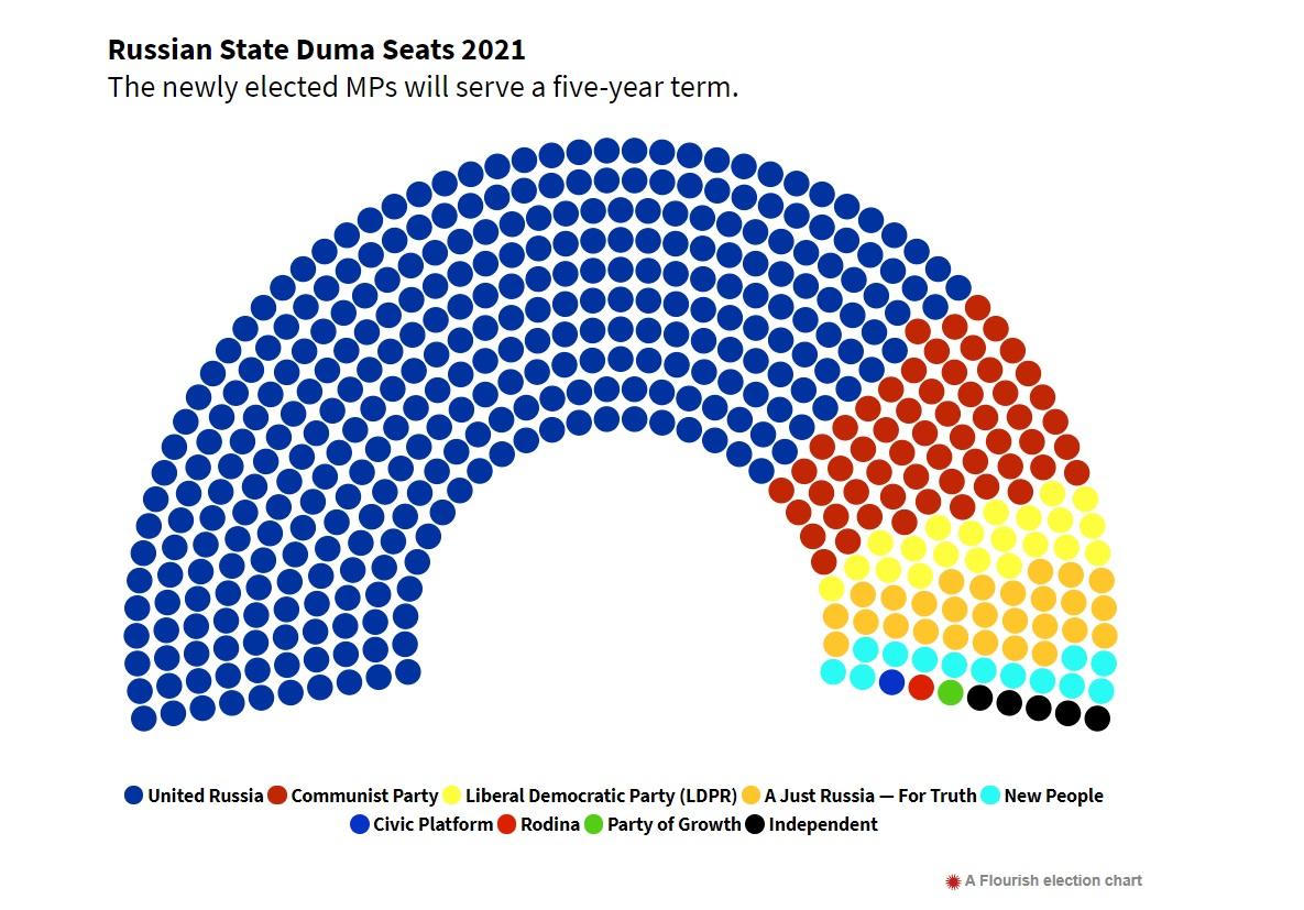 Phân bổ số ghế theo Đảng ở Duma Quốc gia Nga 5 năm tới, trong đó màu xanh dương là số ghế của Đảng Nước Nga thống nhất. |