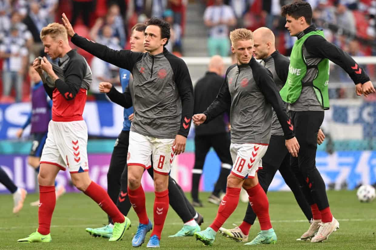 Vào 7h32 tối (giờ địa phương), trận đấu đã được tiếp tục, Mathias Jensen được đưa vào sân thay cho Christian Eriksen.