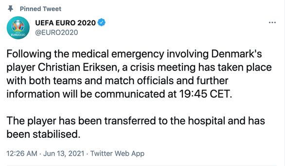Trong thông báo mới nhất, UEFA cho biết Christian Eriksen đã được chuyển đến bệnh viện và đã ở trong trạng thái ổn định. |
