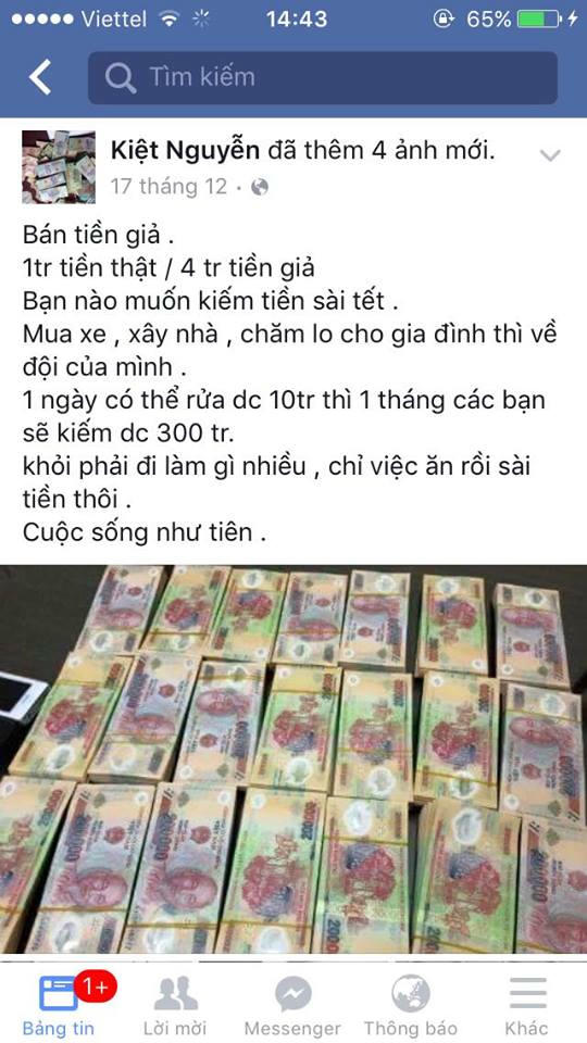 Theo tìm hiểu của phóng viên Báo PLVN, facebook có tên Bích Ngọc rao bán: “Bên mình cho đổi 1 triệu tiền thật lấy 5 triệu tiền giả. Tiền giả giống tiền thật 98% làm từ polymer, có hình chìm, chỉ khác chỗ là các tờ tiền giả cùng mệnh giá có số seri giống nhau, nếu xài 1 tờ thì chắc chắn không phát hiện, đổ xăng, đi chợ, mua hàng tạp hóa đều ok hết, chỉ có ra ngân hàng đối chiếu số seri mới bị phát hiện thôi…”.
