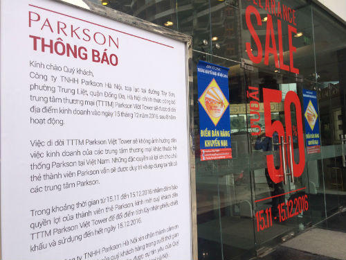 Parkson Viet Tower (tại ngã tư Tây Sơn - Thái Hà) cho biết sẽ dời địa điểm kinh doanh sau 8 năm hoạt động. |