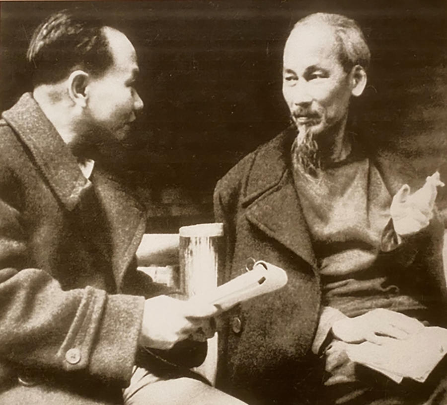 Chủ tịch Hồ Chí Minh và Tổng Bí thư Trường Chinh trao đổi về các văn kiện Đại hội đại biểu toàn quốc lần thứ II của Đảng, tháng 2-1951. Ảnh: Bảo tàng Lịch sử quốc gia