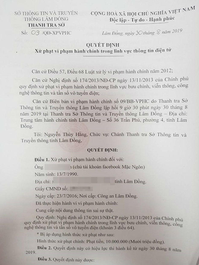 Thanh tra Sở Thông tin & Truyền thông tỉnh Lâm Đồng cho biết vừa có quyết định xử phạt hành chính 10 triệu đồng đối với anh L.H.N (29 tuổi, ngụ xã Hiệp An, huyện Đức Trọng). N bị phạt vì hành vi cung cấp thông tin sai sự thật.