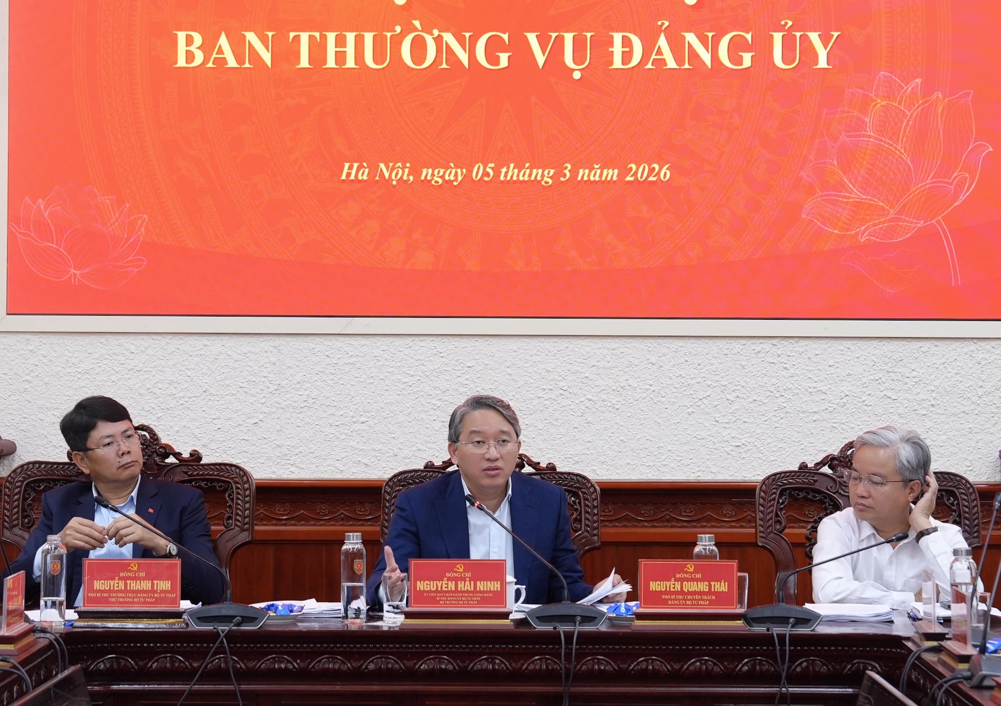 Sáng 5/3, Bí thư Đảng ủy, Bộ trưởng Bộ Tư pháp Nguyễn Hải Ninh chủ trì Hội nghị Ban Thường vụ Đảng ủy Bộ Tư pháp. Cùng dự có Phó Bí thư Thường trực Đảng ủy, Thứ trưởng Bộ Tư pháp Nguyễn Thanh Tịnh; Phó Bí thư chuyên trách Đảng ủy Nguyễn Quang Thái; các Ủy viên Ban Thường vụ Đảng ủy, Thứ trưởng Bộ Tư pháp: Đặng Hoàng Oanh, Mai Lương Khôi.