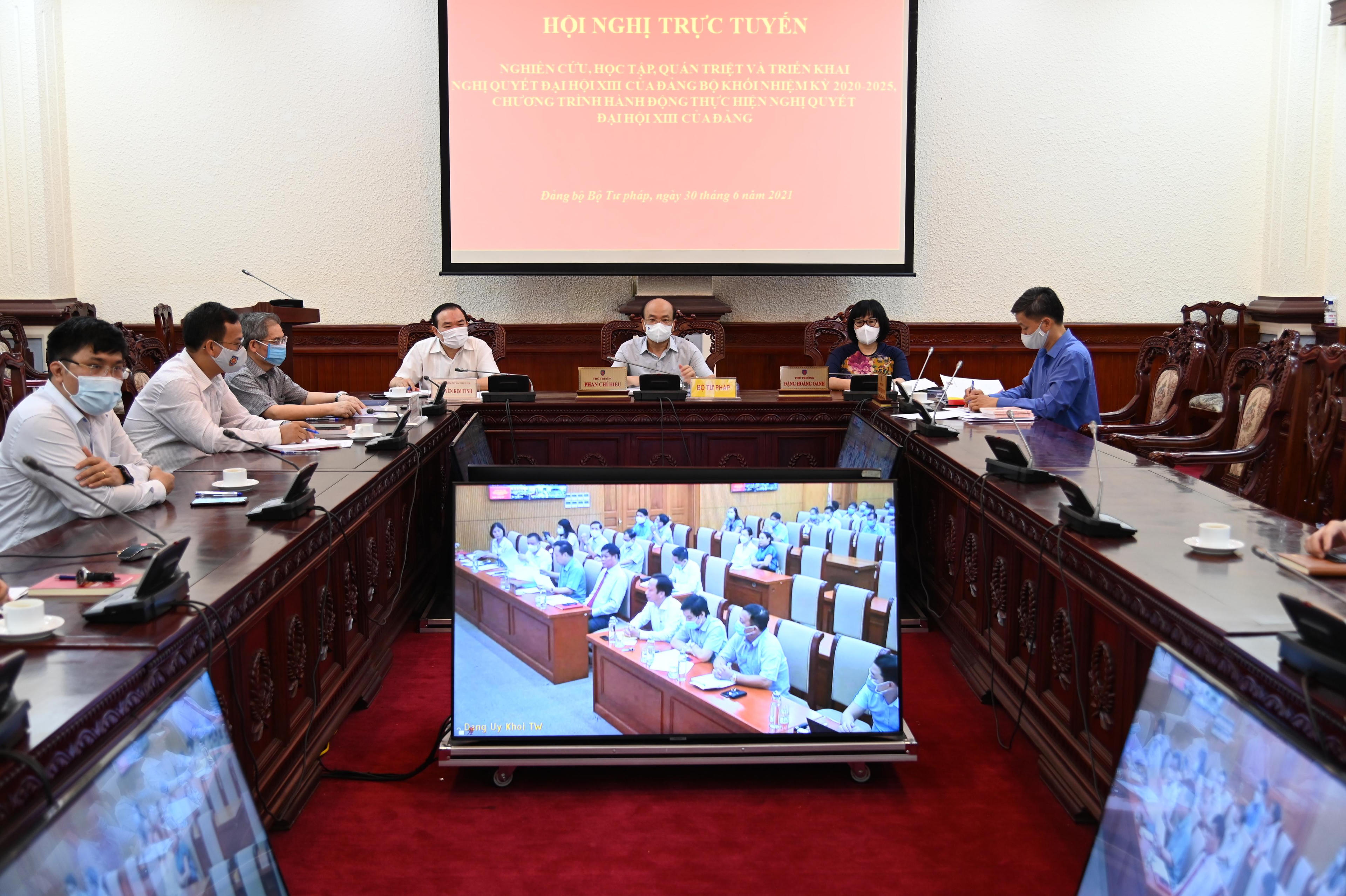 Tham dự và chủ trì tại điểm cầu Bộ Tư pháp có đồng chí Phan Chí Hiếu, Bí thư Đảng ủy Bộ, Thứ trưởng Bộ Tư pháp; đồng chí Đặng Hoàng Oanh, Phó Bí thư Đảng ủy Bộ, Thứ trưởng Bộ Tư pháp; đồng chí Nguyễn Kim Tinh, Phó Bí thư thường trực Đảng ủy Bộ. Đồng chí Nguyễn Khánh Ngọc, Phó Bí thư Ban cán sự Đảng, Thứ trưởng Bộ Tư pháp cùng tham dự.