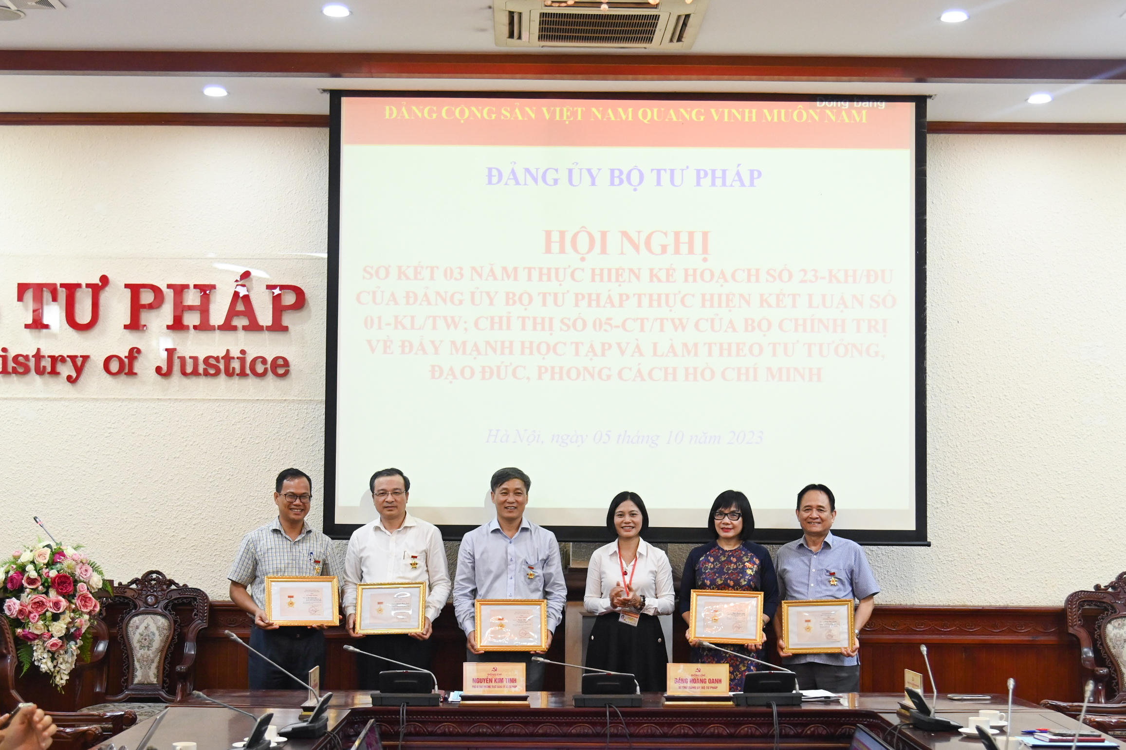 Thứ trưởng Bộ Tư pháp Đặng Hoàng Oanh, Bí thư Đảng ủy Bộ Tư pháp và Phó Bí thư Thường trực Đảng ủy Bộ Tư pháp Nguyễn Kim Tinh đồng chủ trì Hội nghị. Thứ trưởng Bộ Tư pháp Nguyễn Khánh Ngọc, Phó Bí thư Đảng ủy Bộ; Vụ trưởng Vụ Pháp luật (Văn phòng Chính phủ) Nguyễn Hồng Tuyến; Phó Trưởng Ban Tuyên giáo Đảng ủy Khối các cơ quan Trung ương Phạm Thị Vui cùng dự.