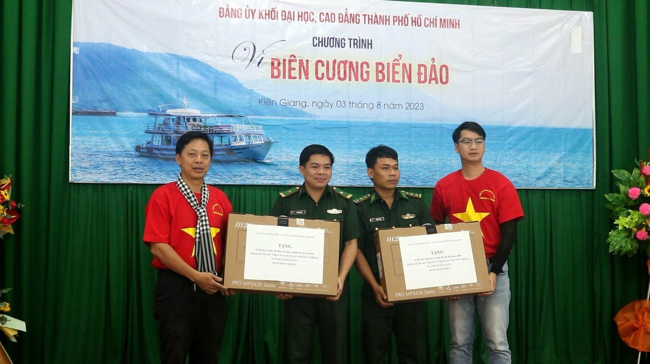 Với tinh thần tri ân các cán bộ, chiến sĩ Đồn Biên phòng Nam Du, Trạm Ra đa 600 Hải quân và Ban chỉ huy Quân sự xã An Sơn, huyện Kiên Hải, tỉnh Kiên Giang không quản khó khăn ngày đêm bảo vệ vững chắc chủ quyền, giữ vững an ninh trật tự trên vùng biển, đảo, đoàn công tác đã trao tặng 03 bộ máy vi tính để bàn cho Đồn Biên phòng Nam Du, Trạm Ra đa Hải quân 600 và Ban chỉ huy Quân sự xã An Sơn, huyện Kiên Hải, tỉnh Kiên Giang.