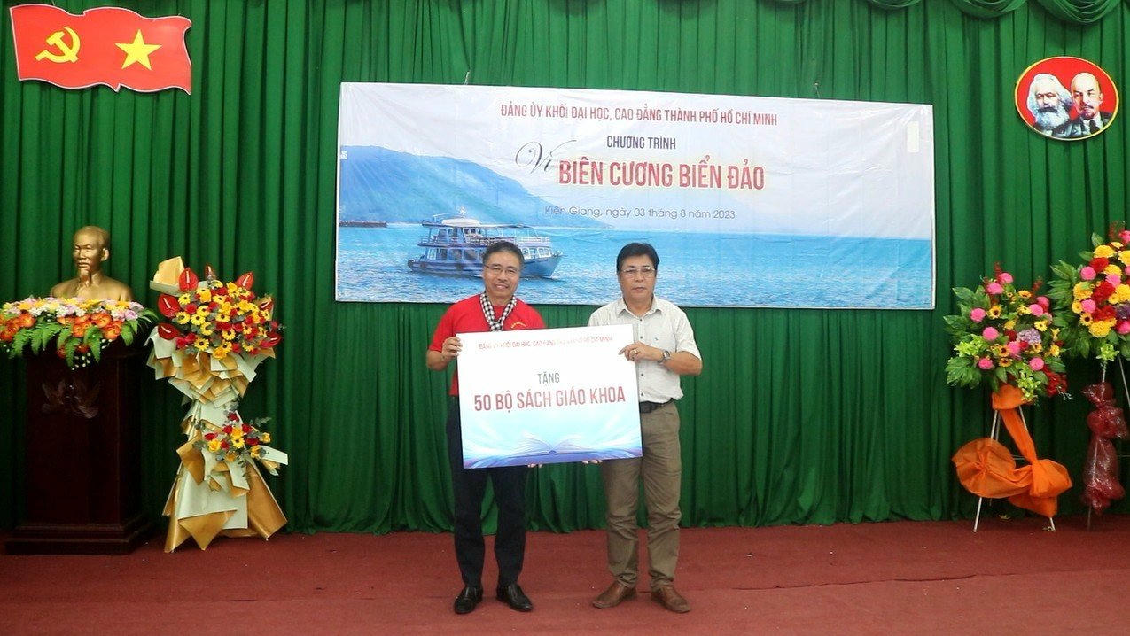 Đồng chí Phạm Cảnh Toàn – Đảng ủy viên Đảng ủy NXBGD Việt Nam tại thành phố Hồ Chí Minh trao tặng 50 Bộ sách giáo khoa. |