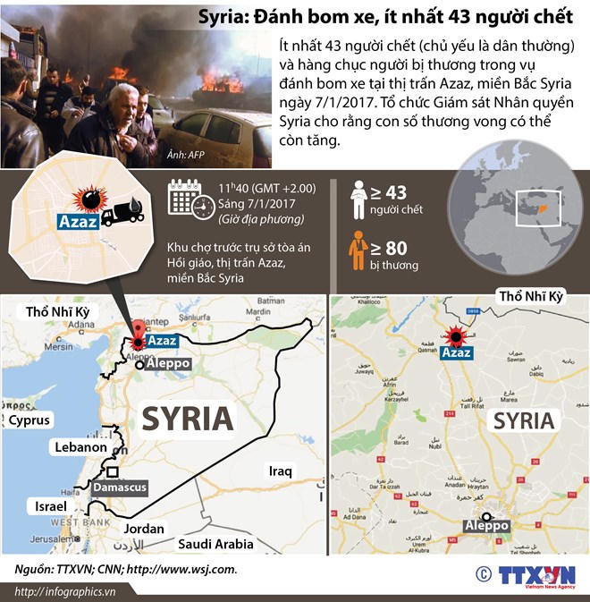 Đánh bom xe đẫm máu ở Syria làm 43 người chết Ít nhất 43 người chết (chủ yếu là dân thường) và hàng chục người bị thương trong vụ đánh bom xe tại thị trấn Azaz, miền Bắc Syria ngày 7/1. Chủ Nhật 08/01/2017 14:15 (GMT+7) Mô tả ảnh