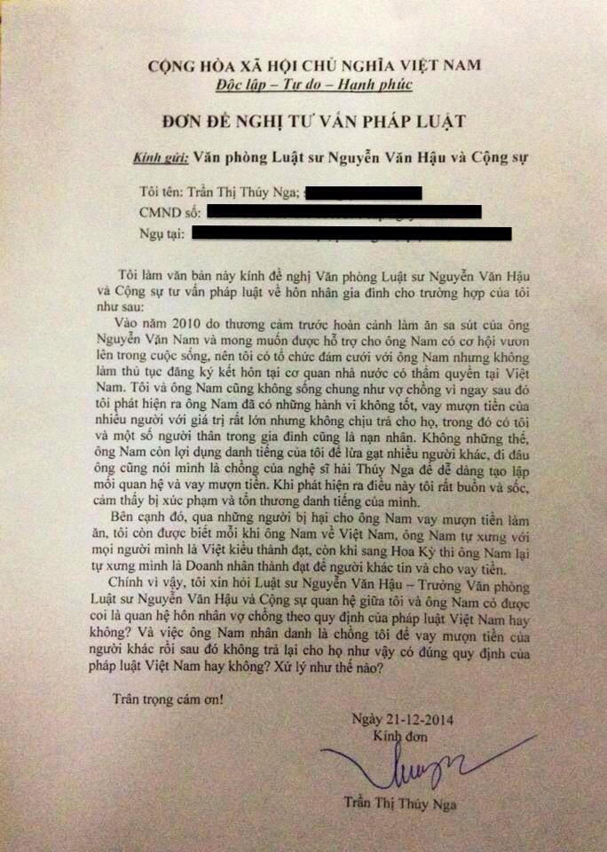 Trong đơn gửi Luật sư, nghệ sĩ Thúy Nga đã nhờ Luật sư tư vấn xem quan hệ giữa chị và ông N có có được pháp luật thừa nhận là vợ chồng hay không? Hành vi của ông N mượn danh nghĩa Thúy Nga đi vay tiền khắp nơi rồi xù nợ có vi phạm pháp luật Việt Nam hay không?