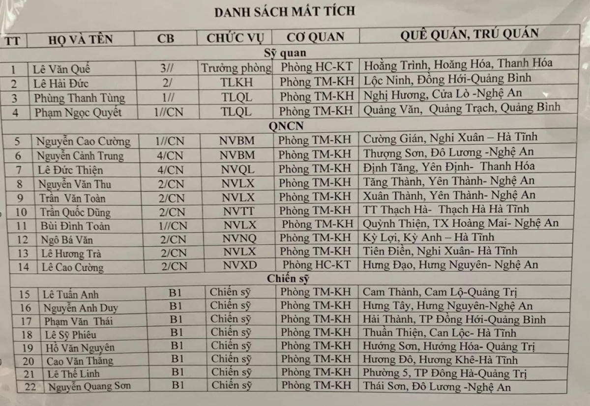 3. Phùng Thanh Tùng, sĩ quan. Quê quán: Nghi Hương, thị xã Cửa Lò, Nghệ An (đã tìm thấy lúc 15 giờ 13 phút ngày 18/10);