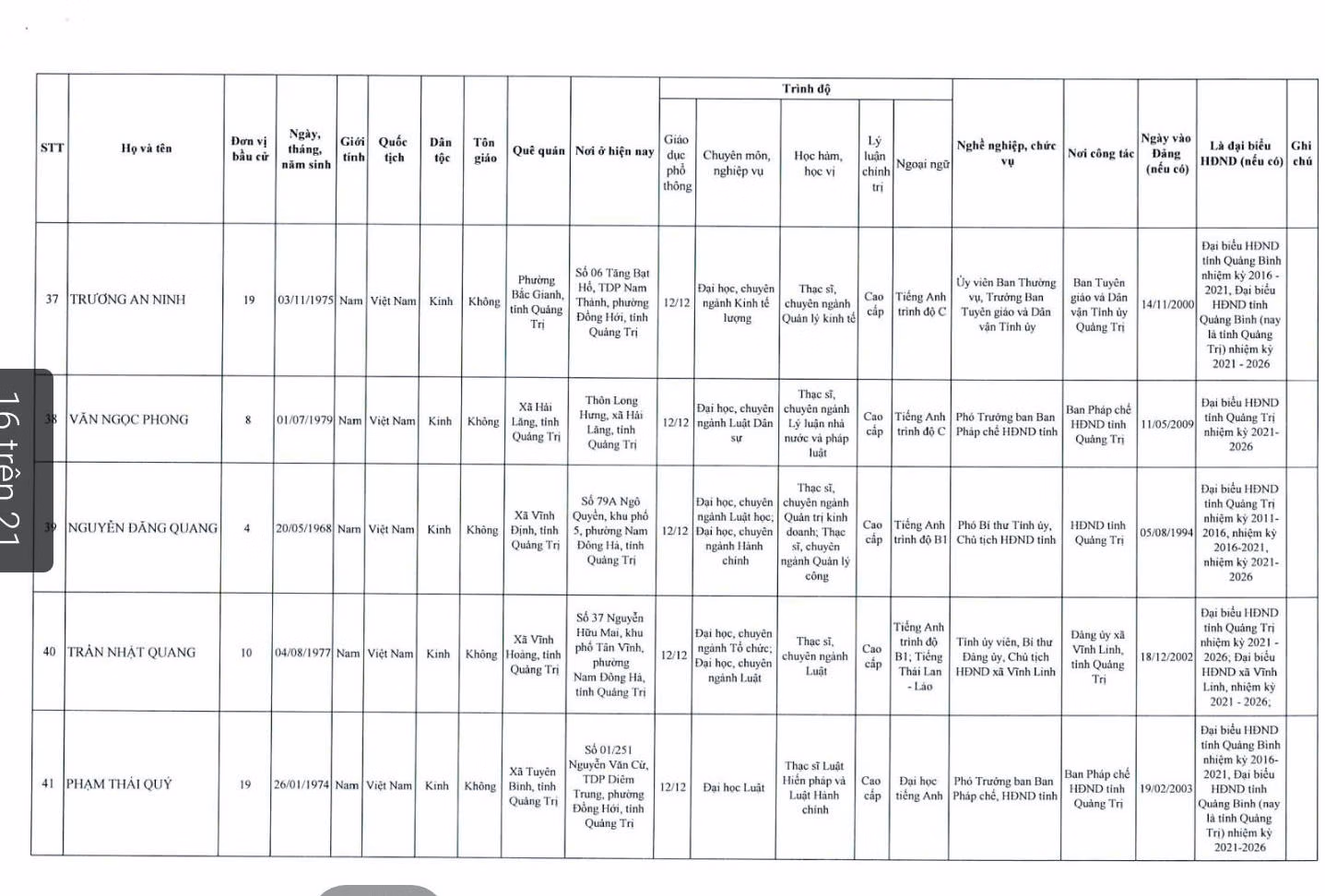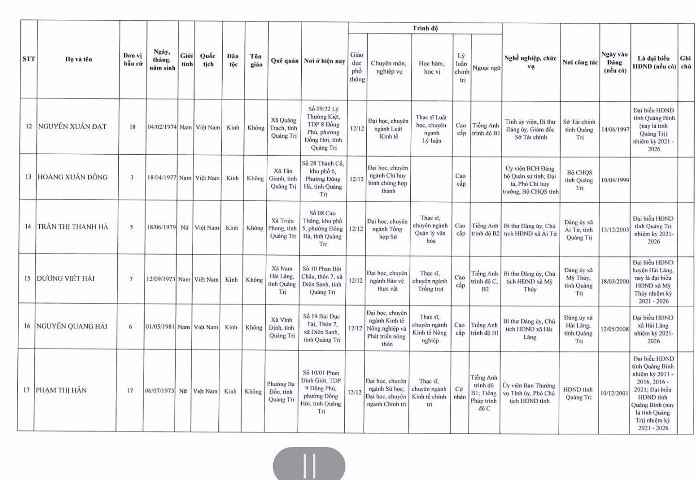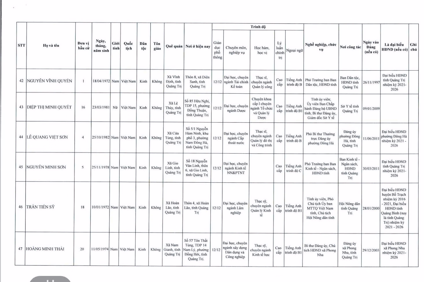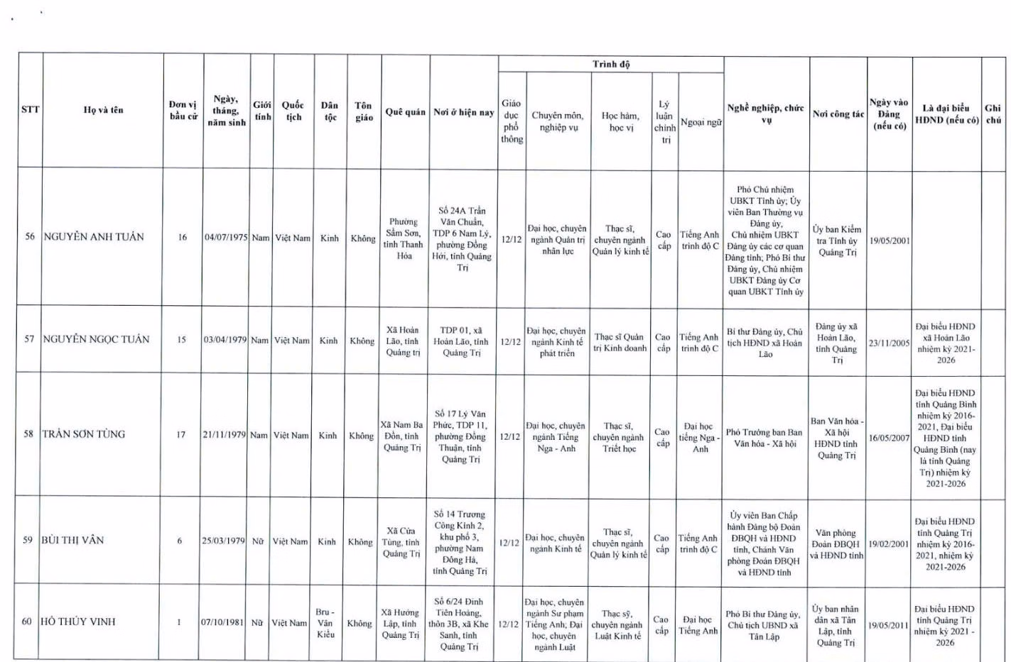 Danh sách 62 người trúng cử HĐND tỉnh Quảng Trị khóa mới Ủy ban Bầu cử tỉnh Quảng Trị vừa công bố danh sách 62 người trúng cử đại biểu HĐND tỉnh Quảng Trị khóa IX, nhiệm kỳ 2026 - 2031. Thứ Tư 18/03/2026 16:25 (GMT+7) Lê Tám Bảy