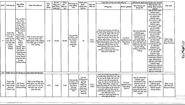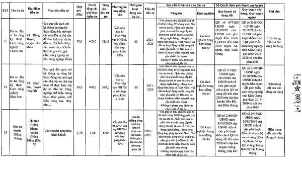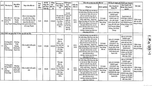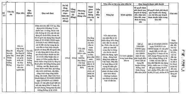 Theo quyết định của UBND tỉnh Kiên Giang, tổng số 55 dự án kêu gọi đầu tư được phân theo nhóm và lĩnh vực gồm: Danh mục dự án đầu tư có sử dụng đất với 3 dự án khu dân cư, khu đô thị mới là: Khu đô thị mới phía Đông trung tâm hành chính huyện Giồng Riềng có tổng vốn đầu tư 400 tỷ đồng; khu đô thị mới phía Tây trung tâm hành chính huyện Giồng Riềng có tổng vốn đầu tư 235 tỷ đồng; khu dân cư Nam An Hòa (TP. Rạch Giá) có tổng vốn đầu tư 658 tỷ đồng.
