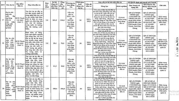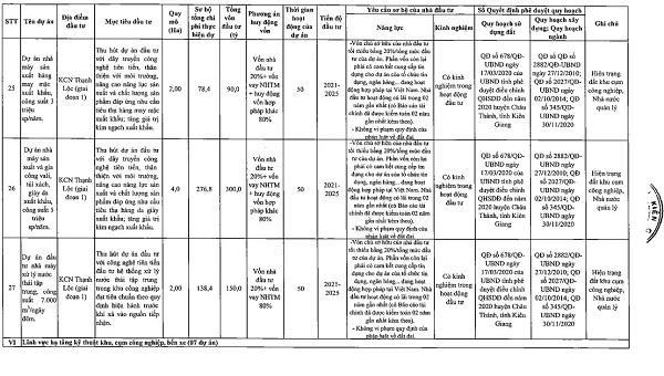 Một số dự án kêu gọi đầu tư tiêu biểu như: Dự án mở rộng hồ chứa nước ngọt dự trữ TP. Rạch Giá (giai đoạn 1), qui mô 25 ha, tổng vốn đầu tư 246 tỷ đồng; dự án đầu tư xây dựng và kinh doanh khu thương mại dịch vụ thuộc tổ hợp khu công nghiệp Xẻo Rô (huyện An Biên), diện tích 71,28 ha, tổng vốn đầu tư 1.280 tỷ đồng; dự án nhà máy sản xuất lắp ráp hàng điện tử, máy tính công suất 500.000 sản phẩm/năm (KCN Thạnh Lộc - giai đoạn 1), diện tích 5 ha, tổng vốn đầu tư 230 tỷ đồng; nhà máy sản xuất dược phẩm, mỹ phẩm công suất 300 triệu tấn sản phẩm/năm (KCN Thạnh Lộc - giai đoạn 2), diện tích 2 ha, tổng vốn đầu tư 300 tỷ đồng; dự án đầu tư hạ tầng kỹ thuật KCN Xẻo Rô (huyện An Biên), qui mô trên 120 ha, tổng vốn đầu tư 3.610 tỷ đồng; dự án đầu tư hạ tầng kỹ thuật KCN Thạnh Lộc (giai đoạn 2 - huyện Châu Thành), qui mô 100 ha, tổng vốn đầu tư 1.800 tỷ đồng; dự án khu bến xe, khu dân cư, chợ đầu mối rau củ quả (TP. Rạch Giá), qui mô 29 ha, tổng vốn đầu tư 450 tỷ đồng; dự án đầu tư xây dựng khu ở công nhân và tái định cư Thạnh Lộc (huyện Châu Thành) qui mô 60,43 ha, tổng vốn đầu tư 3.695 tỷ đồng…