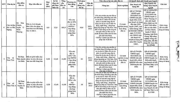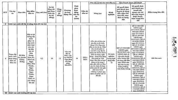 Danh mục dự án kêu gọi đầu tư có 45 dự án. Trong đó, lĩnh vực du lịch 1 dự án, thương mại 6 dự án, môi trường 2 dự án, nước đô thị và nông thôn 2 dự án, sản xuất công nghiệp 16 dự án, hạ tầng kỹ thuật khu, cụm công nghiệp và bến xe 7 dự án, nhà ở và phát triển đô thị 6 dự án, giáo dục và đào tạo 3 dự án, văn hóa và thể thao 1 dự án, lĩnh vực khác 1 dự án.