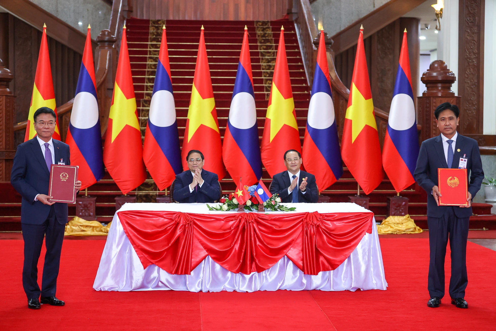 Ngay sau cuộc hội đàm, hai Thủ tướng đã chứng kiến lễ ký kết 10 văn kiện hợp tác, trong đó có Hiệp định giữa Chính phủ Việt Nam và Chính phủ Lào về đối tác số; Hiệp định tương trợ tư pháp dân sự giữa Việt Nam và Lào; Nghị định thư về hợp tác đào tạo giữa Chính phủ Việt Nam và Chính phủ Lào giai đoạn 2022-2027…