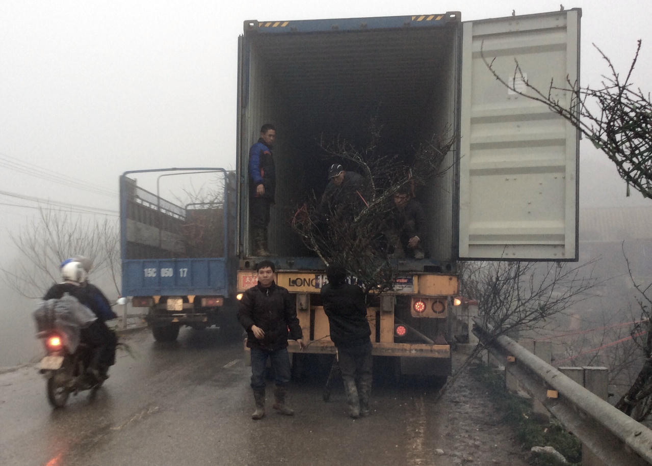 Trên con đường về xuôi, không ai quên mang theo mùa Xuân Sapa trên những sắc hoa đào xuống phố. Hàng loạt xe tải, xe contenno cũng tranh thủ chất đầy hoa đào chở về xuôi đón Tết.