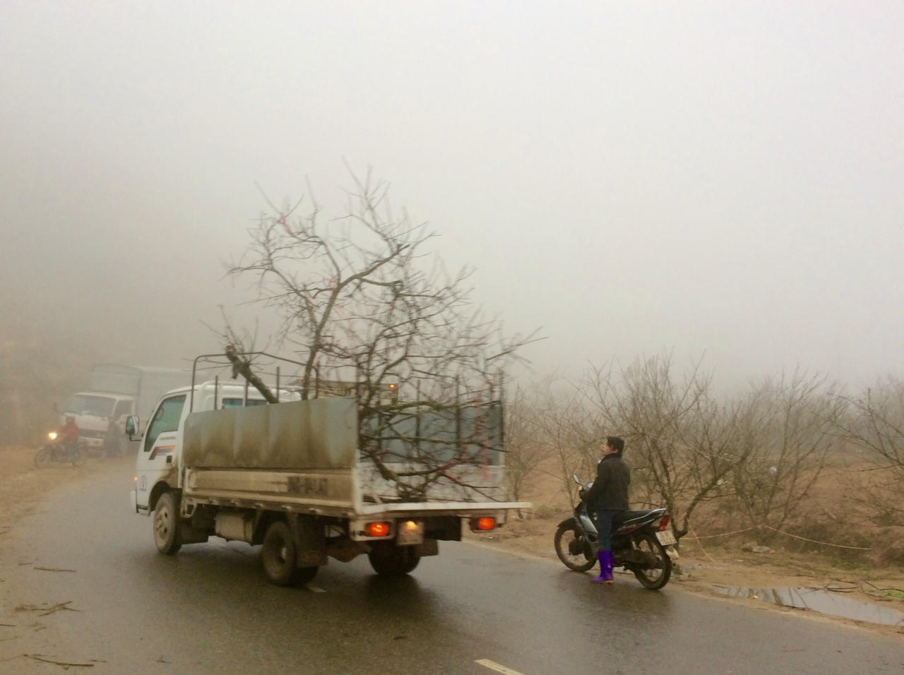 Mặc dù trời rất lạnh, mưa phùn, sương mù dày đặc, nhưng không khí Xuân vẫn ngập tràn trên những triền dốc cheo leo, nơi những cành đào đá đang xếp hàng chờ về xuôi đón Tết!