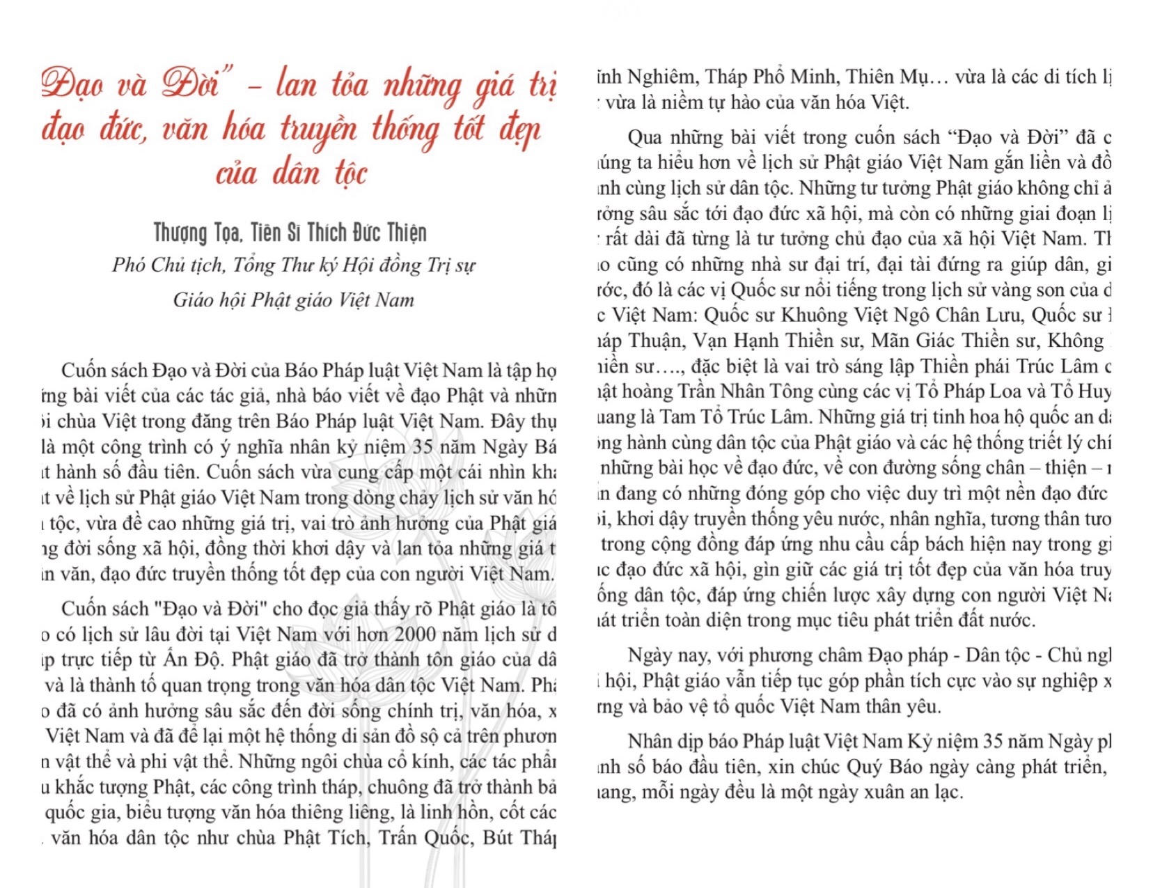 Cuốn sách được những người làm báo Pháp luật Việt Nam xem như một nén tâm hương dâng lên cõi Phât, dâng lên tổ tiên, các vị thánh nhân tiền bối, cũng là món quà tinh thần tri ân bạn đọc đã thủy chung, tin yêu, đồng hành cùng Báo trong suốt 35 năm qua. Xin trân trọng giới thiệu bài viết của Thượng tọa, Tiến sĩ Thích Đức Thiện - Phó Chủ tịch, Tổng Thư ký Hội đồng Trị sự Giáo hội Phật giáo Việt Nam về cuốn sách này.