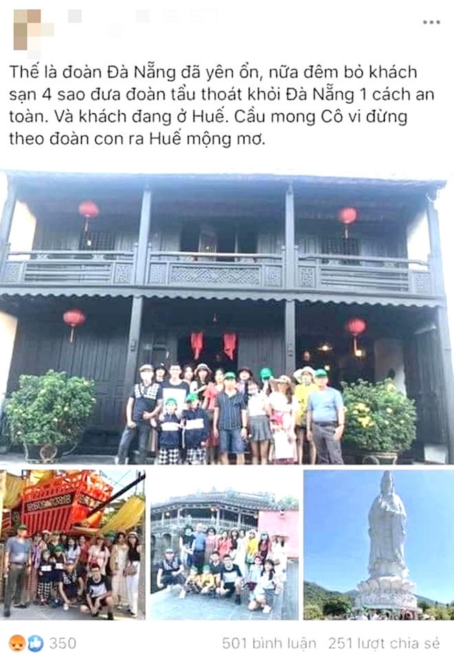 Một số hình ảnh cho thấy đoàn khách khá đông đã đến tham quan những địa điểm danh thắng, di tích ở Hội An, Đà Nẵng, Đại nội Huế. Dòng trạng thái trên mạng xã hội như một lời kể công đầy tự hào của người HDV này: “Thế là đoàn Đà Nẵng đã yên ổn. Nửa đêm bỏ khách sạn 4 sao đưa đoàn tẩu thoát khỏi Đà Nẵng 1 cách an toàn. Và khách đang ở Huế…