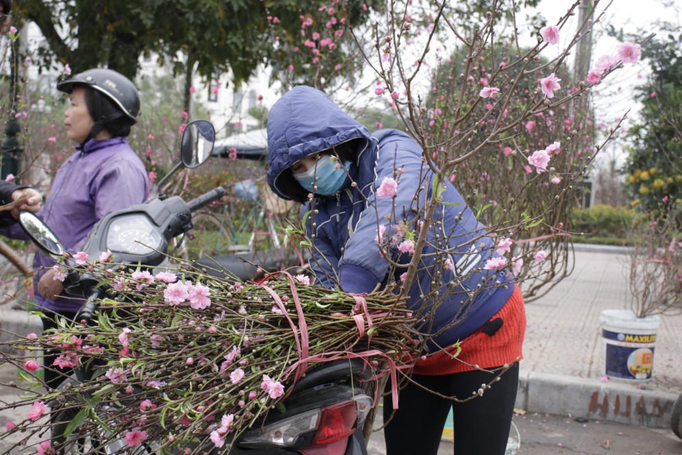 Nhiều cành đào nhỏ đã rực hồng khắp phố phường Hà Nội, phục vụ người dân chưng Tết sớm, cắm bàn thờ