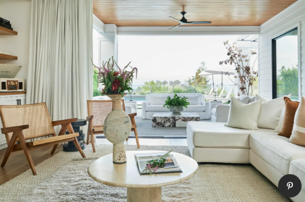 Phòng khách của ngôi nhà thiết kế thoáng đãng, với cửa lớn nhìn ra bên ngoài. Olivia cũng thiết kế một bộ sofa đặt ngoài trời để cô có thể hít thở không khí trong lành.