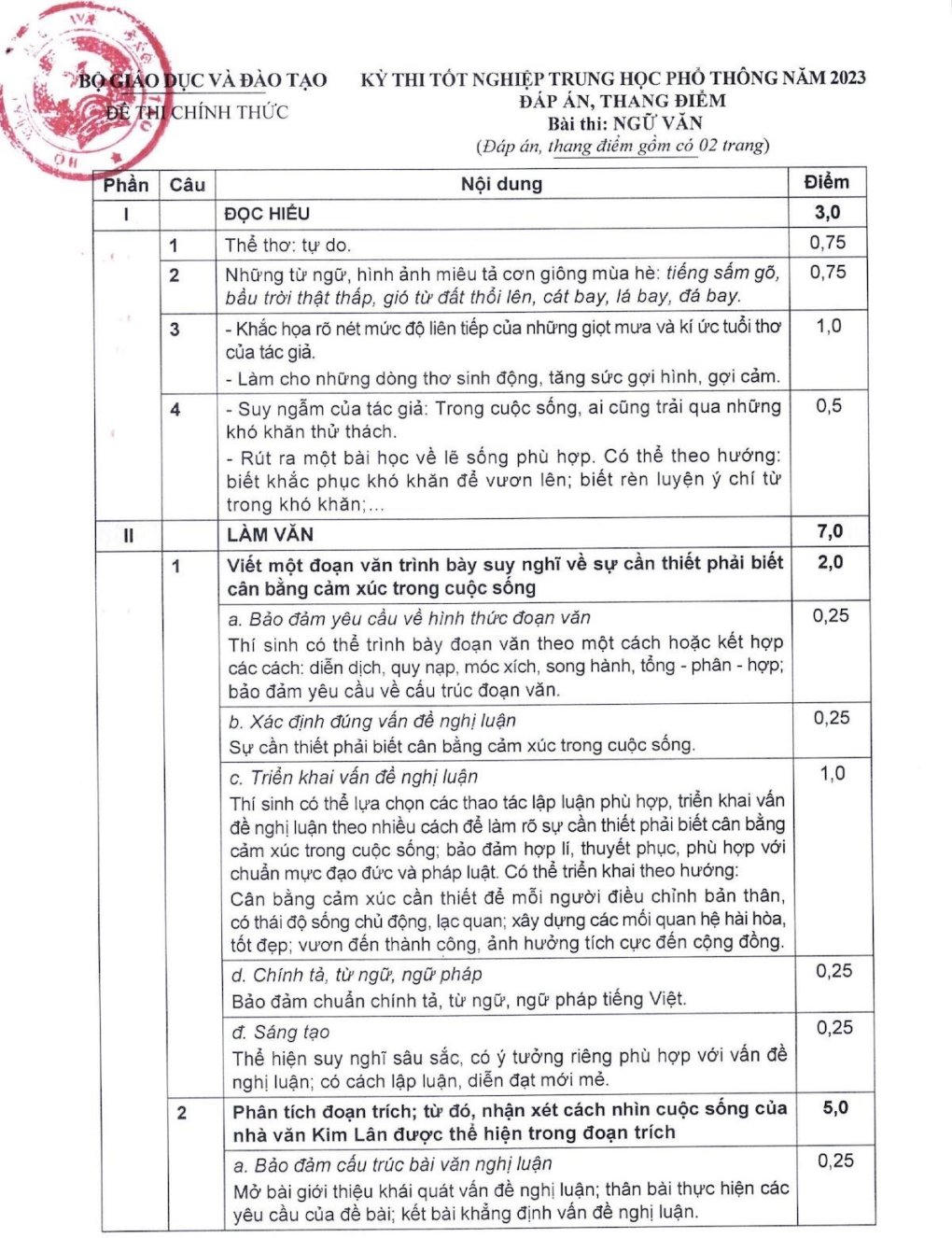 Đáp án và thang điểm bài thi môn Ngữ văn. |