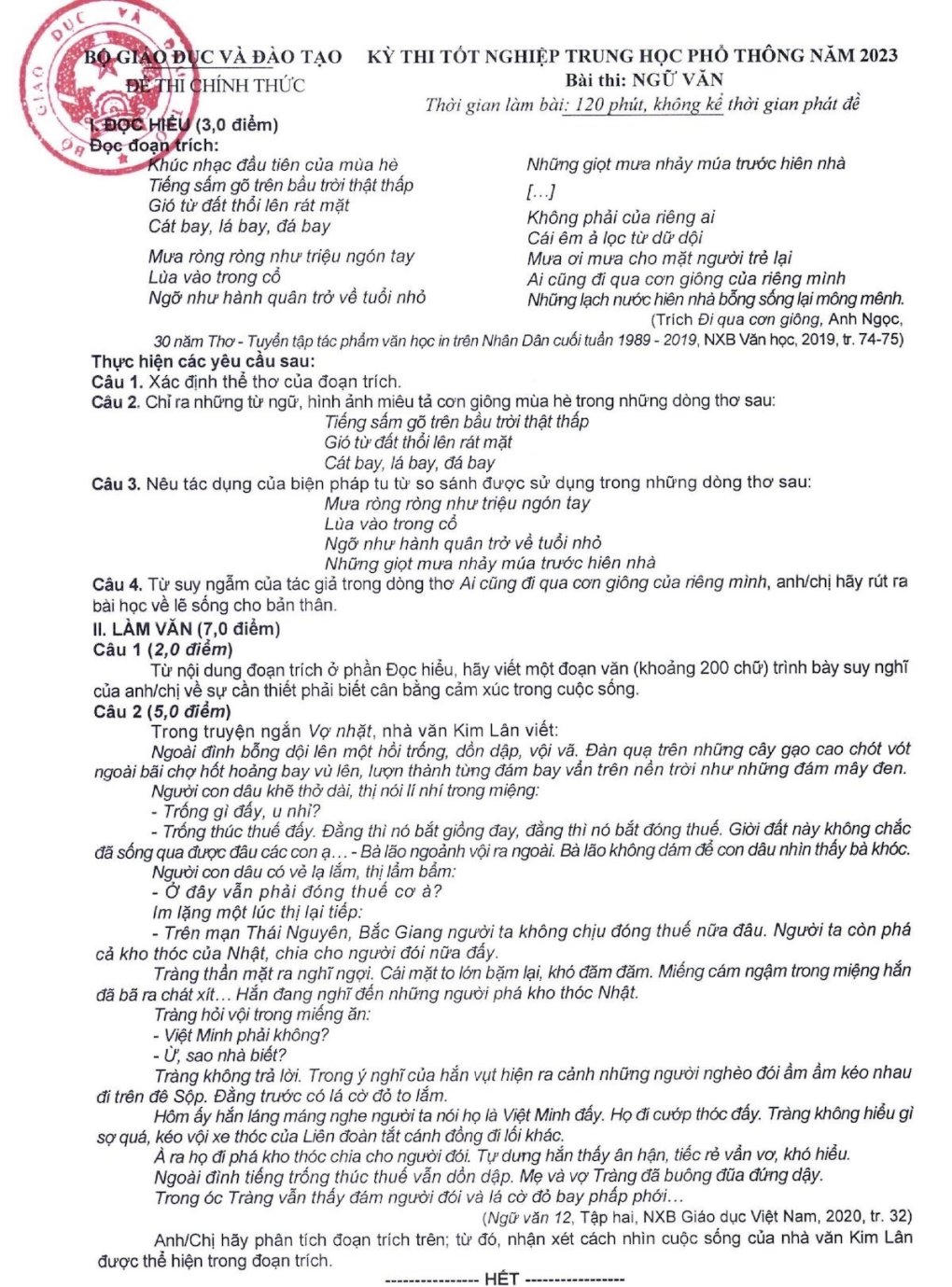 Chi tiết đề thi, đáp án và thang điểm bài thi tốt nghiệp môn Ngữ văn năm 2023 do Bộ GD&ĐT công bố:
