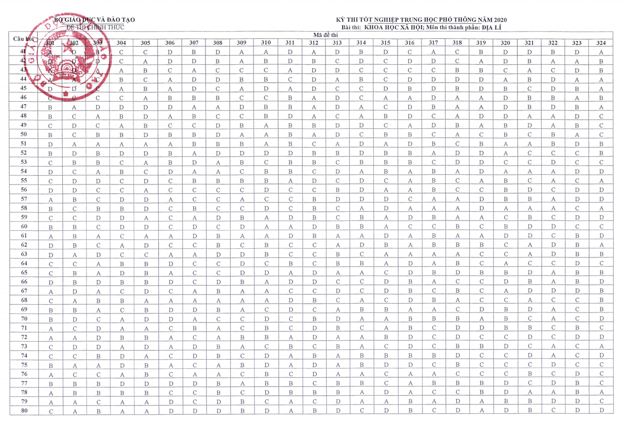 (PLVN) - Bộ GD&ĐT đã công bố đáp án chính thức môn Đía lý thi tốt nghiệp THPT năm 2020. Cập nhật đáp án môn Địa lý tại Baophapluat.vn.