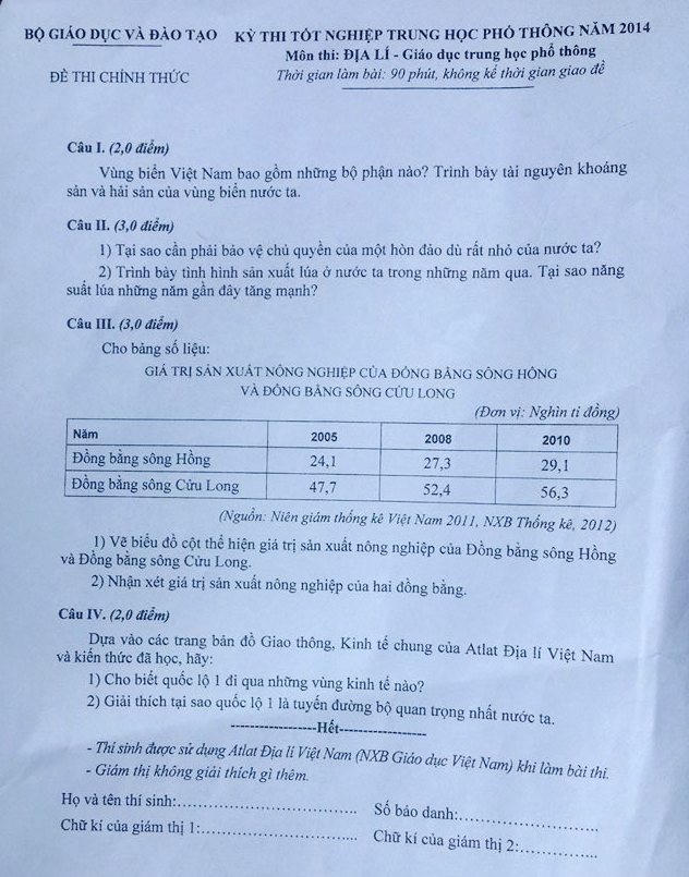 Đáp án đề thi tốt nghiệp THPT môn Địa lý 2014