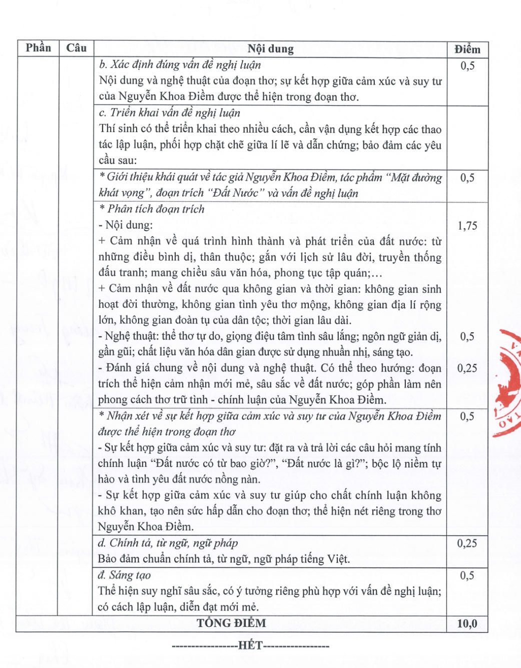 Trong số 15 môn thi tốt nghiệp, Ngữ văn là môn duy nhất thi theo hình thức tự luận với thời gian 120 phút. Đáp án và thang điểm môn Ngữ văn như sau: