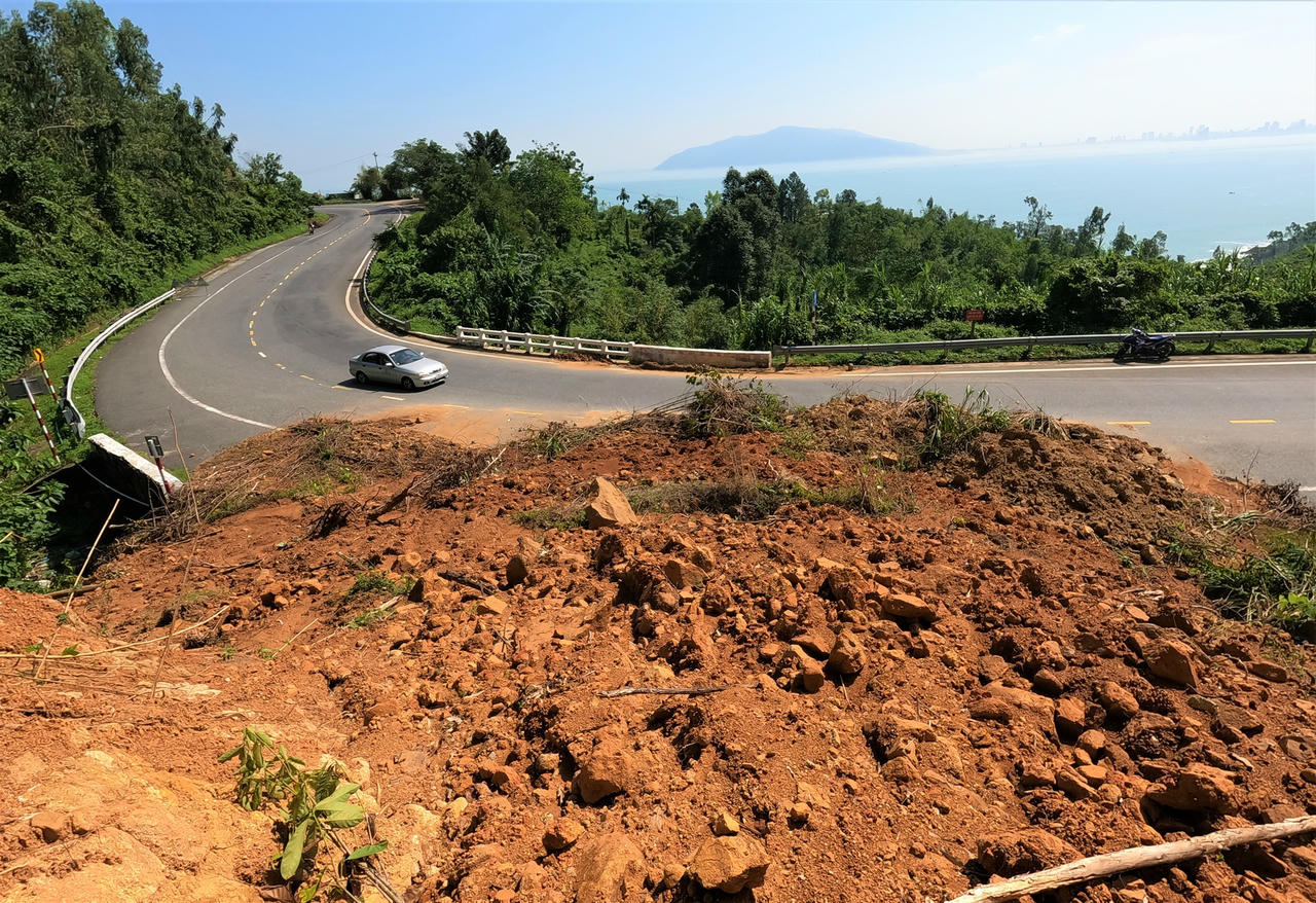 Một điểm sạt lở lớp đá kè taluy âm, khoét hàm ếch để lộ ra phần nhựa đường trên cùng đèo Hải Vân, khiến nhiều người lưu thông qua đây "vừa đi vừa run".