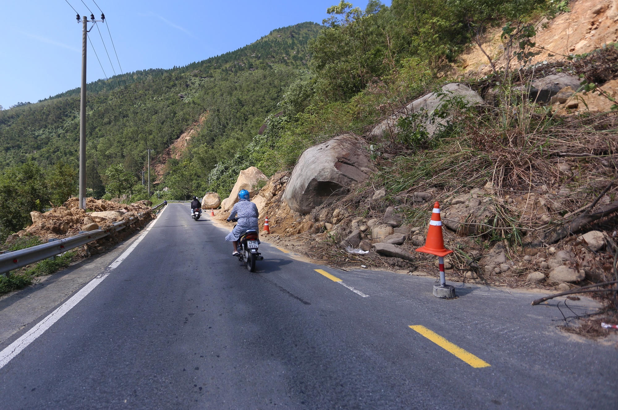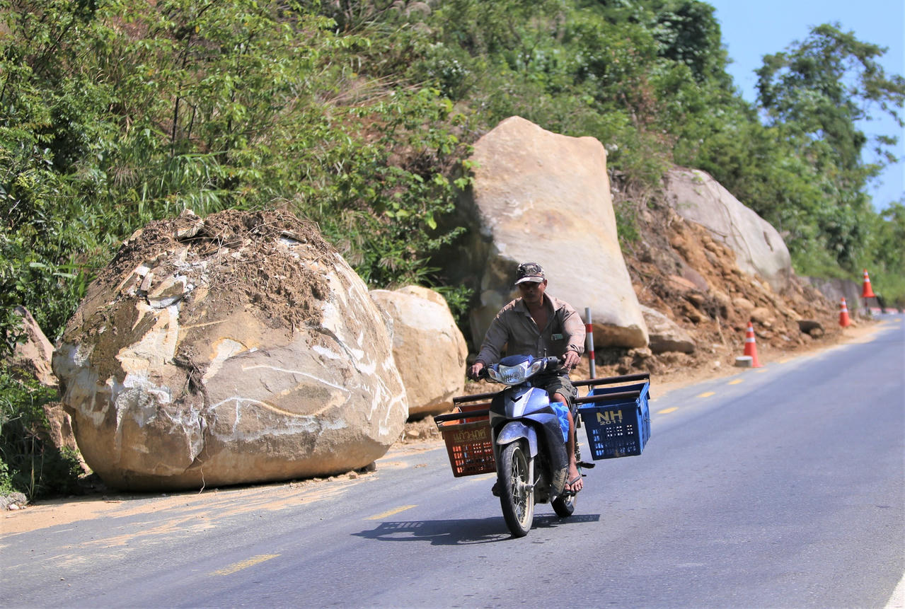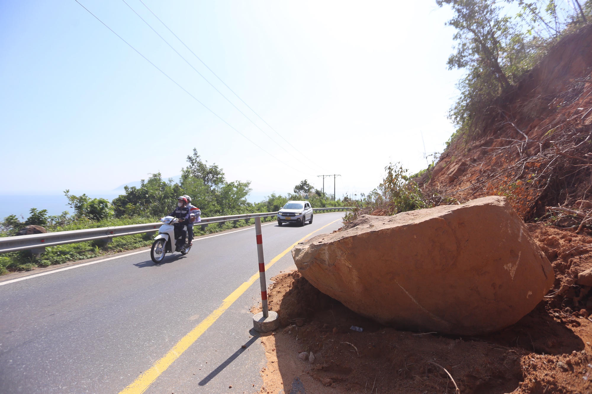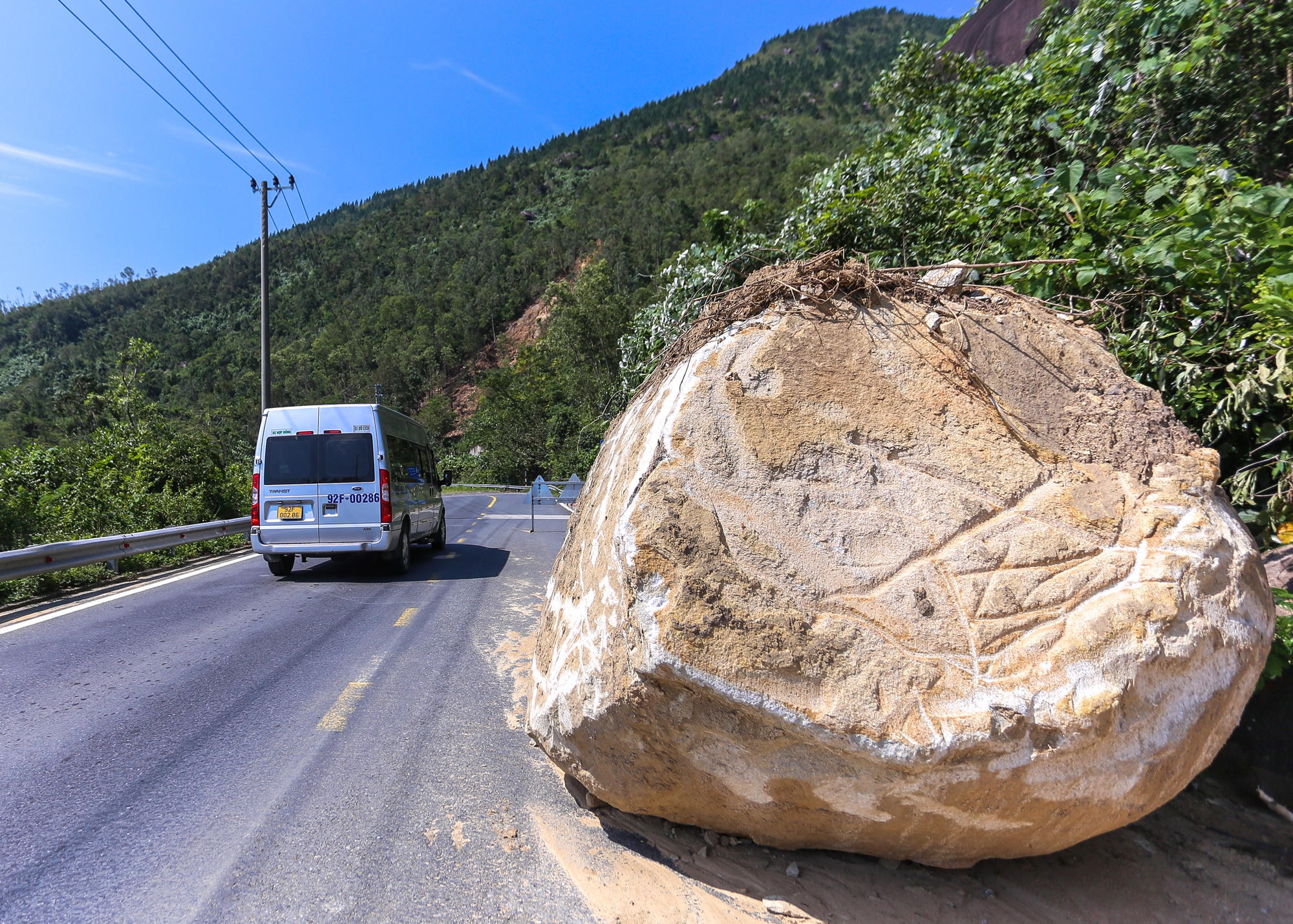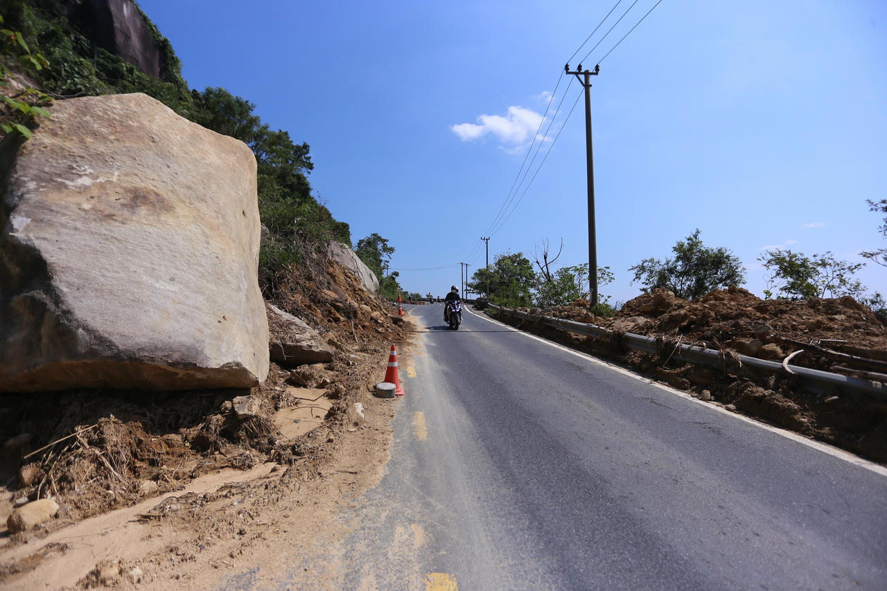 Những tảng đá "khổng lồ" lăn từ trên núi xuống đường và chưa được xử lý, khiến giao thông qua đoạn đường đèo gặp nhiều khó khăn.